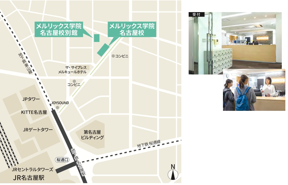 メルリックスデンタル名古屋校は、中部地方最大のターミナル駅である「名古屋駅」から徒歩3分という通学しやすい立地にあり、JR・名鉄・地下鉄各駅にもすぐのアクセスです。高層ビルが立ち並ぶ名駅前から、並木通りを奥に入った閑静なオフィス街にあるため、受験勉強に専念するには最適な環境です。