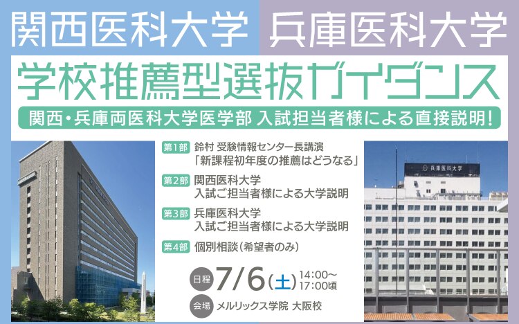 13:30 開場 14:00 メルリックス情報センター長講演 『新課程初年度の推薦はどうなる』 14:30 関西医科大学 入試担当の先生によるご講演 15:20 兵庫医科大学 入試担当の先生によるご講演 16:00 大学担当者との個別相談(ご希望の方のみ) ※保護者のみのご参加も可能です |