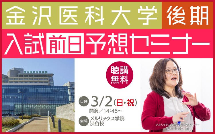 14:30 開場 ※メルリックス2階 受付 14:45 金沢医科大学 一般入試(後期) 直前ガイダンス&合格のポイント解説 ※当初の予定より時間が変更になりました 15:15 終了 |