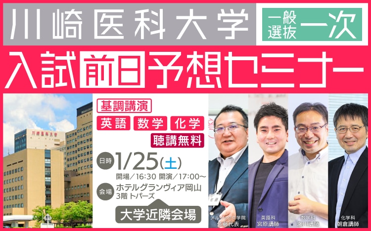 今年もねらい目である川崎医科大学の一次試験前日に、直前ガイダンスとワンポイント予想講座を岡山駅直結のホテルグランヴィア岡山で開催します。